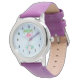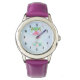Een horloge met een afbeelding van een mamma en baby roze flamingo die op een bed van bloemensucculente bloemen staan met groene palmbomen die in de rug zwaaien. Tropisch en . De achtergrond is lichtblauw. Klok gezicht is samengesteld uit zwarte art deco stijl nummers.