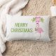 Een grillig tropisch kerstkussen. Een fancy roze flamingo met een poot omhoog. Het dragen van een roze kerstmuts en een seizoensgebonden hulst. Een bloemenboeket boven haar hoofd met suikerriet gekruist samen. Vrolijk kerstfeest in grote groene letters.
