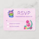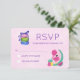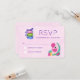 Een platte RSVP-reactiekaart met een roze achtergrond voor de waterverf. Een schattige flamingo illustratie met watermeloenen en ananas. Ook een trio van macaronen met een boog.