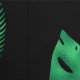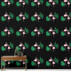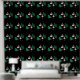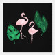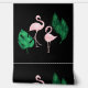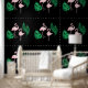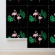 Dit aangepaste behang heeft een tropisch roze flamingo-ontwerp op een zwarte achtergrond. Een afbeelding van twee roze flamingo's en levendige groene palmbladeren is betegeld over het behang. Het afbeelding heeft een folie ontwerp dat het een metaalachtige uitstraling geeft.