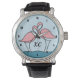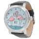 Roze Flamingos Monogram Art, of een Foto Zwart Lederen Horloge voor Mannen. Horloges voor vrouwen zijn beschikbaar. Personaliseer deze sjabloon met je initialen, vervang de leuke flamingokunst door je kunst of foto's.