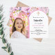 Voeg uw eigen foto met verticale afmetingen toe. Een roze boogvormige foto lijst. Een witte achtergrondkleur. Versierd met roze bloemen en een gouden kruis. Personaliseer en voeg een naam en details toe. 1 vel = 1 uitnodiging bedrukt rand tot rand.
