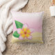 Deze kussen bevatten Destei's schattige afbeelding van een roze en oranje frangipani-bloem met twee groene bladeren. De achtergrond is een roze gradiënt met zandtextuur op de bodem die tot een summiere strandvibe leidt.