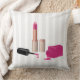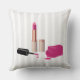 Een kussen met een glazen vormgeving. Hete roze lippenstift en nagellak. Het nagellak flesje is open, leggend aan zijn kant, met druppels nagellak die eruit komen.