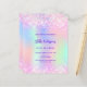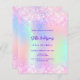 Een meisjesachtige en vrouwelijke 21e verjaardagsfeestuitnodiging. Op voorzijde: Een regenboog, holografische gekleurde achtergrond in paarse, roze, muntgroen. Versierd met blush roze sparkles. Personaliseer en voeg een naam en feestdetails toe. De naam is geschreven met een handgemerkt stylescript, paarse gekleurde letters.