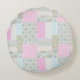 Een chic Round Pillow of Cushion, met een , nostalgisch faux patchwork-patroon van roze Dogroses op een hemelblauwe achtergrond met overeenkomende poka-punten, strepen en pleisters. Als onderdeel van het collectie "Rosy Posy", dat uit Posh & Painterly bestaat, kan dit patroon gemakkelijk worden aangepast om het even welke Pillow of Cushion te passen.