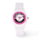 Wild zebra print kunstschaatsen horloge in roze. Een kunstschaatser silhouet poseert binnen een cirkel en er is een "polka-dot" banner voor contrast. Voeg uw eigen naam toe voordat u bestelt! Gebruik daarnaast de knop "Aanpassen" voor meer opties, waaronder een ander lettertype! ©gollygirls.com
