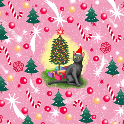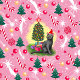 Dit is een mooi, speels, vrolijk roze kerstontwerp. Het toont een zwarte kat met een kerstboom en een patroon van snoepjes, kleine groene boompjes, sneeuwvlokken en vallende sterren die rondzweven.