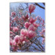 blanco briefkaart met roze magnolias tegen blauwe hemel