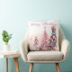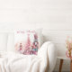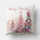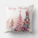 Dit aangepaste gooi kussen heeft een roze Notenkraker kerst thema op een effen witte achtergrond. Personages uit het verhaal van de Notenkraker zijn afgebeeld rond een roze gekleurde kerstboom. De Sugar Plum Fairy ballerina is links afgebeeld, en de gigantische Notenkraker en Muiskoning zijn rechts afgebeeld. Een voorbeeld "Vrolijk kerstfeest" groet is afgedrukt boven de illustratie die u kunt personaliseren om uw eigen begroeting, aangepaste naam of andere tekst op te nemen.