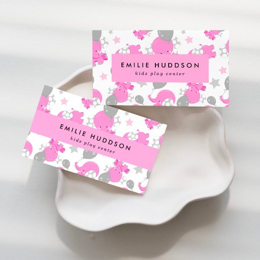 Schattigee, leuke en schattige visitekaartjes met roze olifanten, ballonnen en sterretjes. Modern en trendy design, perfect voor kinderspeelcentra, speeltuinen, activiteitencentra, kinderopvang, kinderopvang, babysitters en kindermeisjes.