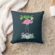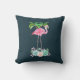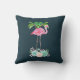 Kussen met een illustratie van een roze flamingo met groene palmbomen erachter en staand op een bed van bloemensucculente bloemen. Tropisch en . De achtergrond is donkerblauw.
