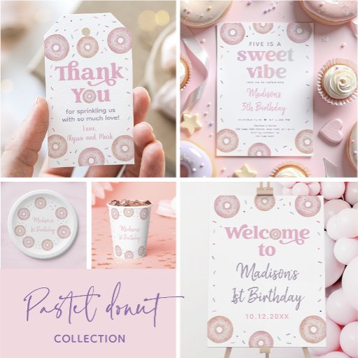 Vier de verjaardag van je kleintje op de liefste manier! Dit charmante donut-verjaardagsontwerp bevat mijn originele handgeschilderde waterverf-kunstwerk met pastelroze matte donuts en kleurrijke sproeiers.