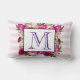 Een gepersonaliseerde eengrammaticeerde lumbale kussen met een bloemenzakje, bestaande uit lichtroze rozen en donkerroze poppies met veel groene bladeren. Een lijst gelaagd over bovenkant om uw douanetekst binnen te zetten. De achtergrond is een zacht pastelroze gestreepte patroon.