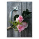 Een printkaart met een foto van een kleine boeket van drie lichtroze rozen en groen gewikkeld met een omhulling die in het handvat van een schuurdeur rust. Witte tekst vooraan zegt: "Dank je wel." Binnenzijde is leeg. Deze kaart kan ook in kleinere notecard worden aangeschaft. Zoek naar huwelijksuitnodigingen en nog veel meer op Jill's Paperie.