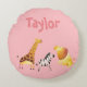 en roze, deze ronde kussen kenmerkt een roze achtergrond met wilde dieren zoals een zebra, giraffe, en leeuw. Pas jouw naam in roze doopvont aan. Pas vandaag uw kussen aan!