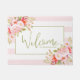 Welkom gasten met deze elegante en vrouwelijke welkom deurmat. Deze aanpasbare deurmat met roze pioenen en gebladerte met roze strepen. Personaliseer door uw familienaam of korte teksten toe te voegen.