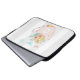 Laptophoes met een grillige illustratie. Een roze theepot met een klein roze hart in het midden en een boeket met bloemen erin. Geschikte pastelkleurige vlinders die rondfladderen. Reeks op een grijze en witte striped achtergrond.