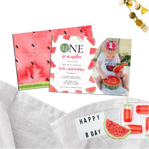 Roze Watermeloen Een in een meloen eerste verjaard KaartRoze Watermeloen Een in een meloen eerste verjaard Kaart (Voorkant)Roze Watermeloen Een in een meloen eerste verjaard Kaart (Achterkant)
