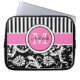 Deze gepersonaliseerde zwarte, roze, en witte floral damask laptophoes bevat tekstvakken die u kunt aanpassen met uw eigen naam, initialen, bedrijfsnaam of andere tekst. Als u hulp nodig hebt bij het aanpassen, kunt u een e-mail sturen naar niteowlstudio@gmail.com.