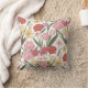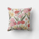 Het is een werpkussen met een illustratie van rozen, tulpen en lelies. Ze zijn in verschillende kleuren, zoals rood, roze, geel en wit. De bloemen zijn gerangschikt op een manier die een patroon vormt. De achtergrond is wit.