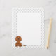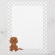 Destei's originele cartoon illustratie van een schattige ruby-kleur Cavalier King Charles Spaniel die zit. Het midden is wit terwijl de grenzen een patroon van grijze pootdrukken hebben.