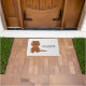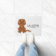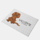 Destei's originele cartoon illustratie van een schattige ruby-kleur Cavalier King Charles Spaniel die zit. Er is ook tekst die nu "Welkom" samen met een aanpasbaar tekstgebied voor een familienaam of andere aangepaste tekst leest. De achtergrond heeft een patroon van grijze pootafdrukken.