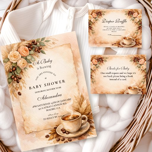 Warm, cozy, and full of autumn charm, this “A Baby Is Brewing” design blends soft neutral florals with rich coffee accents for the perfect rustic celebration. Featuring vintage parchment texture, warm beige and caramel tones, delicate roses, coffee beans, and a steaming cup detail, it creates an inviting café-inspired atmosphere. Ideal for fall gatherings, brunch themes, or coffee-loving moms-to-be, this design feels intimate, stylish, and effortlessly charming.