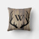 De bijtende boerenhouten achtergrond met 3 familiesleuven, zwarte lijsten, en een monogram in wit. De achterkant van de kussen heeft hout- en zwarte hertengeweien met een monogram.