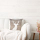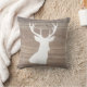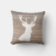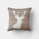 Rol, bijtend wit silhouet van een mannelijke hertenkop met geweien boven een houten achtergrond.