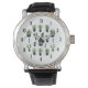 Een horloge met een bijtende westerne smaak. Ontworpen met een hoop schattige groene kakoekjes in een repetitief patroon. Specifiek, groene gekleurde prikcactus, in allerlei vormen en maten, elke zittend in zijn eigen donkerblauwe bloempot. Kleine decoratieve driehoeken daartussen. Fantastische leuke illustratie.