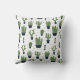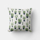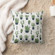 Een kussen met een rustieke westerne smaak. Ontworpen met een bos schattige groene cactussen in een herhalend patroon. Specifiek, groen gekleurde stekelige cactus, in allerlei soorten vormen en maten, elk zittend in zijn eigen donkerblauwe bloempot. Kleine decoratieve driehoekjes ertussen. Grappige illustratie.