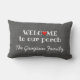 Gepersonaliseerde, boerderijstijl in de openlucht kussen-Trendy, rustige burlap, schaamteloze achtergrond in grijs. Leest 'Welkom in onze veranda' met een roodhart dat de letter 'O' vervangt. Gepersonaliseerd met familienaam in handgeschreven kijkt manuscript bij de bodem. Hetzelfde op de achterkant. Opmerking: Alle afbeeldingen zijn afgedrukt. Niet echt. Gemaakt van buitenmateriaal om weerstand te bieden aan het weer. Het zou een prettig welkom zijn voor de bijtende cabine of boerderij. Geweldig gepersonaliseerd cadeau voor huisverwarming of een cadeau voor de landschuur van een bruiloft. We hebben coördinerende, bijtende kussens en meer boerderijkusstijlen in onze winkel Zazzle.com/angela65. Verzamel ze allemaal!