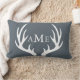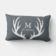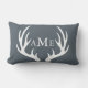 Grijze verwisselbare achtergrond met witte hertengeweien silhouette en uw keuze voor monogram tekst op voor en achter! Deze lumbale kussen zijn een uitstekend geschenk of accent voor dat luie huis dat in een prachtige houten omgeving is weggestopt.