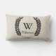 Gedetailleerde schets van de molen op een faux canvaspatroon aan de voorkant van de kussen. De achterkant van de kussen is voorzien van een zwarte lauweren met een lijst dat uw keuze uit een gepersonaliseerde monogram letter en familienaam in zwarte tekst bevat.