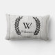Gedetailleerde schets van de molen op een wit gewassen houten plank, gedrukt op de voorkant van de kussen. De achterkant van de kussen is voorzien van een zwarte lauweren met een lijst dat uw keuze uit een gepersonaliseerde monogram letter en familienaam in zwarte tekst bevat.
