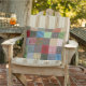 Decoratief rustiek patchwork ontwerp in lichtblauw, rood, groen, wit en grijs tinten voor landhuis en terras.