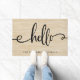 Dit portret is voorzien van een rustige, linen burlap achtergrond en een moderne zwarte typografie die "hallo" zegt.