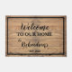 De rotsachtige houten plankklep zegt "Welkom bij ons thuis" en is gepersonaliseerd met "NAAM" en het jaar dat is ingesteld. Een zwarte streep schetst de rand van de mat.