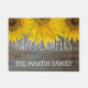 Kute rustic country floral zomer of herfst home decor gift for rvers, gepensioneerde reizigers, tuinders, kampeerders en outdoorsy types - Gepersonaliseerd, rustig bos ziet er uit als een soort leestoor - Happy Campers in rustische stijl met een sjabloon voor het toevoegen van familienaam hieronder in witte, handgeschreven, bliksemletters. Tegen een achtergrond van bijtend hout, dat in nood verkeert, is schitterend en oud met zonnebloempitten van jumbo-geel land die de bovenste grens versieren. Ook een groot cadeautje voor gepensioneerden die klaar zijn om op de weg te gaan of een cadeau voor hun familie voor hen die graag in hun huis willen reizen. herfstdecor. Zouden zich thuis vlak voor een RV of primitieve logcabine bevinden.
