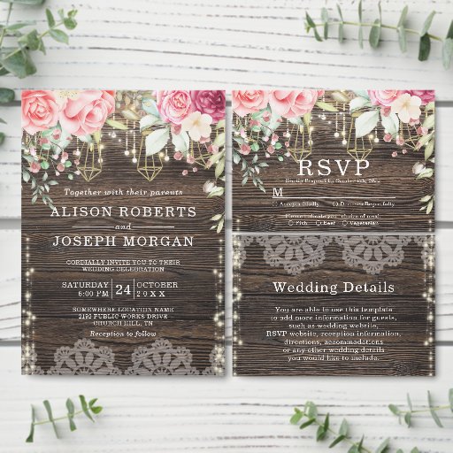 Rustic Wood Floral String light Wedding Rehearal Kaart