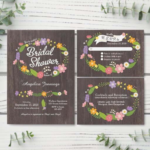 Een rustige huwelijksuitnodiging met een sprookjesachtige florale kreet, bestaande uit kleurrijke bosflora. De achteroverse bohemen-vibe maakt dit ontwerp een uitstekende keuze voor tuinbruiloften in de openlucht.