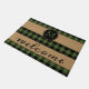 Fun doormat met hedendaags zwart en groen gevlekt vlakpatroon op de achtergrond van de schoot. Stijlvol, stijlvol, uniek ontwerp met ruimte om uw eigen familienaam monogram aan te passen of aan te passen. Oorspronkelijk gepersonaliseerd monogrammed buitendecor accent voor het versieren van de voorste veranda of de voortuin van uw landhuis, blokhut, bergkam, viskamp, meer- of riviervakantiehuis.