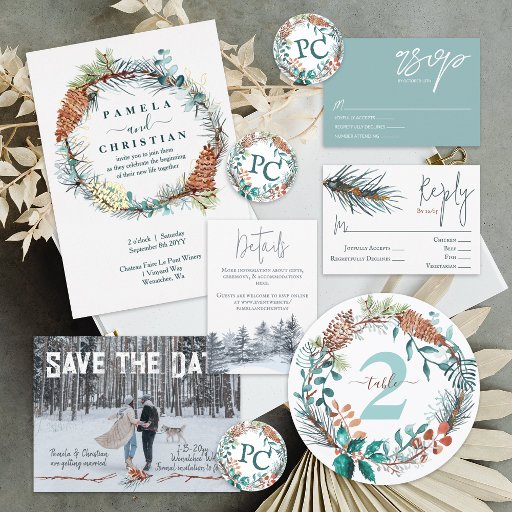 Rustieke dennennaalden aangepaste winter bruiloft receptie diner menu's. Het kunstwerk van de winterdennennaald is veelzijdig voor een verscheidenheid van roest, koper, terracotta, en salie groene huwelijkskleurenpaletten. Elegant evergreen plant ontwerp is mooi op receptie diner borden.