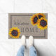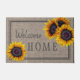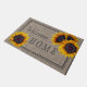 Rustiek land Welkom Home deurmat met grote gele gouden zonnebloemen over een jute achtergrond.