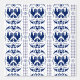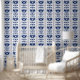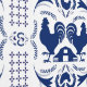 Blauw en wit landelijk rustiek decor patroon met rug-tot-rug hanen en een schuur met extra bloemstijl (floralia) details van Holiday Hearts Design.