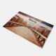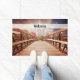 Een welkome deurmat met een schilderachtig foto. Een houten brug die leidt naar een pad omgeven door bospomen die van kleur veranderen.