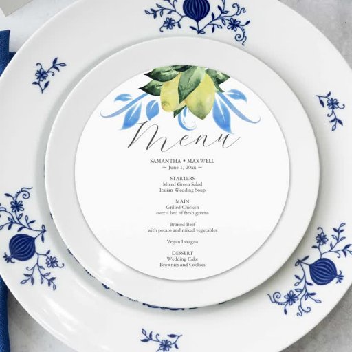 Ontworpen om te coördineren met mijn waterverf citroen tak bruiloft briefpapier collectie deze elegante diner menukaarten kunnen worden gepersonaliseerd met uw namen en maaltijdkeuzes. Ze zijn voorzien van mijn originele waterverf kunst en maken de perfecte aanvulling op uw tafel instellingen. Het woord Menu wordt gebruikt in een modern kalligrafieschrift. De botanische kaart verandert in een gratis citruspatroon in blauw en geel. Perfect voor bruiloften, repetitie diners, een verlovingsfeest en recepties. Ga naar www.zazzle.com/dotellabelle om de hele bruidssuite te bekijken