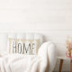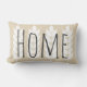 Creamy tan gooit kussens met witte tarwekorrels en het woord "familie" op de voorkant in donkergrijs. De achterzijde heeft de naam van uw familie in grijs.