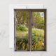 Gele bloemen, groen gras en bomen. Mooie natuur buiten een oud raam. Rustisch oud Wood achteraan. Fotografie.